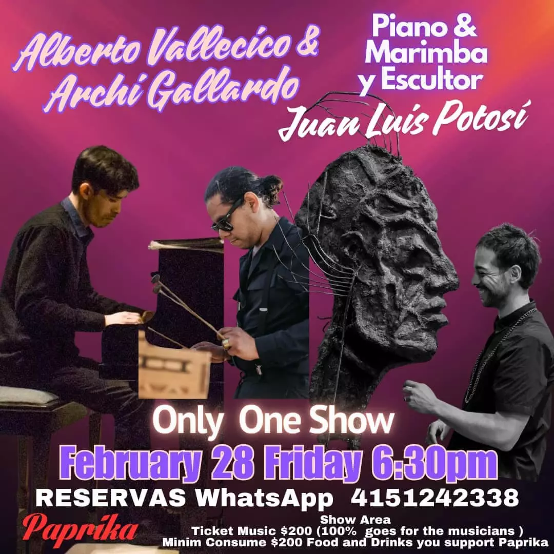 In the first part of the concert we have the recent graduate of the faculty of Xalapa Veracruz, J Alberto Chávez Vallecillo, offering a solo piano concert in the first part of this concert followed by a contemporary fusion proposal formed by Archivaldo Gallardo on the Chiapas marimba.