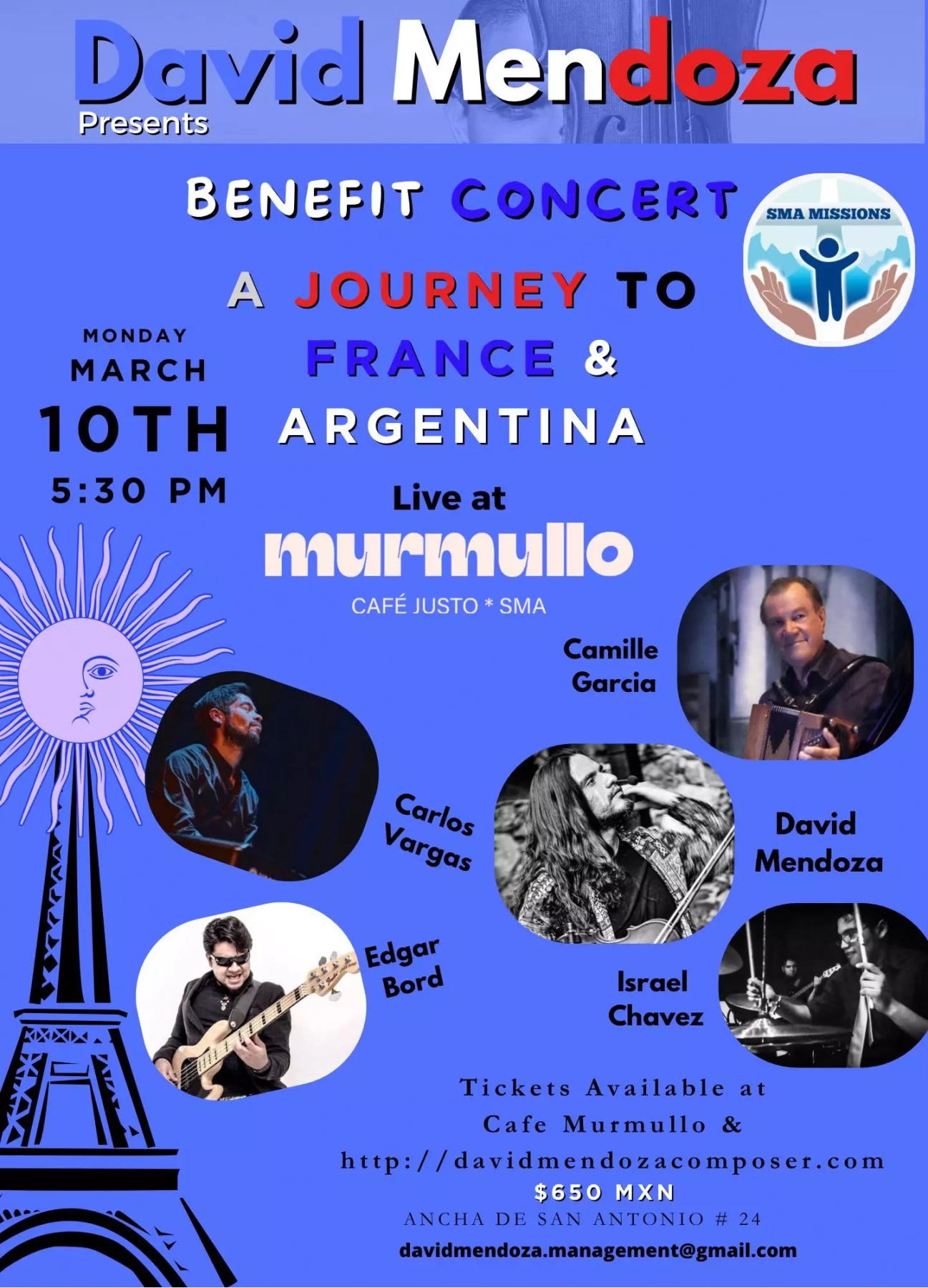 David Mendoza will offer a BENEFIT CONCERT to SLSW, AC (SMA Missions) that provides medical and spiritual assistance to children from vulnerable sectors of Mexican society in rural and marginal urban areas. For this concert he will share one of the favorite genres of his followers, his gorgeous French/Argentinian Music Concert. Performing traditional French waltzes by Edith Piaf & Tony Murena, classical music by Erick Satie, also presenting Contemporary compositions by the French virtuosos Yann Tiersen and Renaud Garcia-Fons as well as Traditional Tangos and Modern French and Argentinian Tangos. This beside the best French Accordion player living in San Miguel Camille Garcia, the talented Edgar Bord on Bass, the amazing Carlos Vargas.