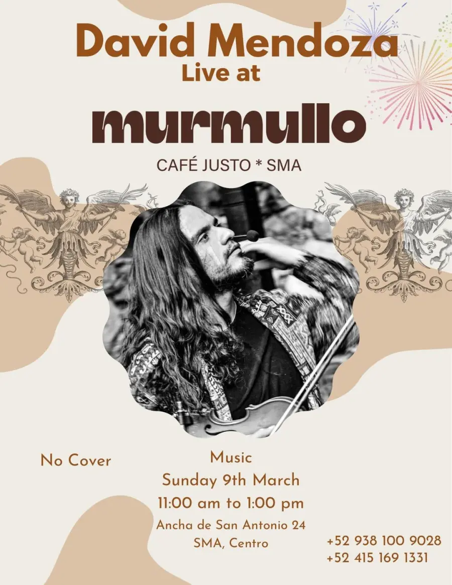 David Mendoza has been playing with the best musicians in San Miguel de Allende and México city, included the English Grammy nominee Michael Hoppè, that describes David as “Wonderfully expressive violin playing…quite simply one of the most beautiful sounds one can hear”. Being David his violinist since 2017 in albums as well as performing in his local concerts. Mendoza will play on brunch this Sunday March 23th , Live at Cafe Murmullo, He will share romantic motion pictures music, New age music, as well as Hungarian music with his amazing Violin playing. A morning with David Mendoza Violin playing would be the difference of an amazing Sunday for you and all your Family. Cafe Murmullo is one of the most beautiful venues in SM, that is part of the Instituto Allende,this amazing artist accompanied by a delicious brunch will make your morning !