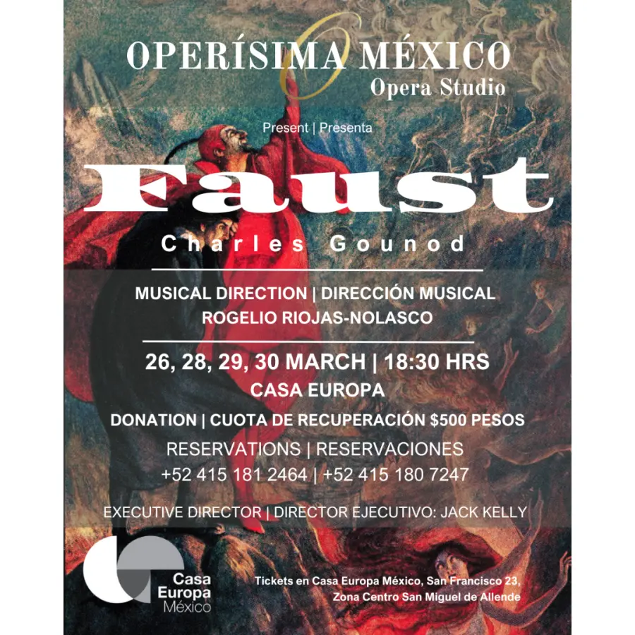 Faust, the acclaimed opera by Gounod, will be performed by the talented group of young singers from OperÃsima México, under the direction of the internationally renowned Maestro Rogelio Riojas Nolasco. Experience a unique concert version that includes scenic movements that will bring you closer to the characters and the plot.