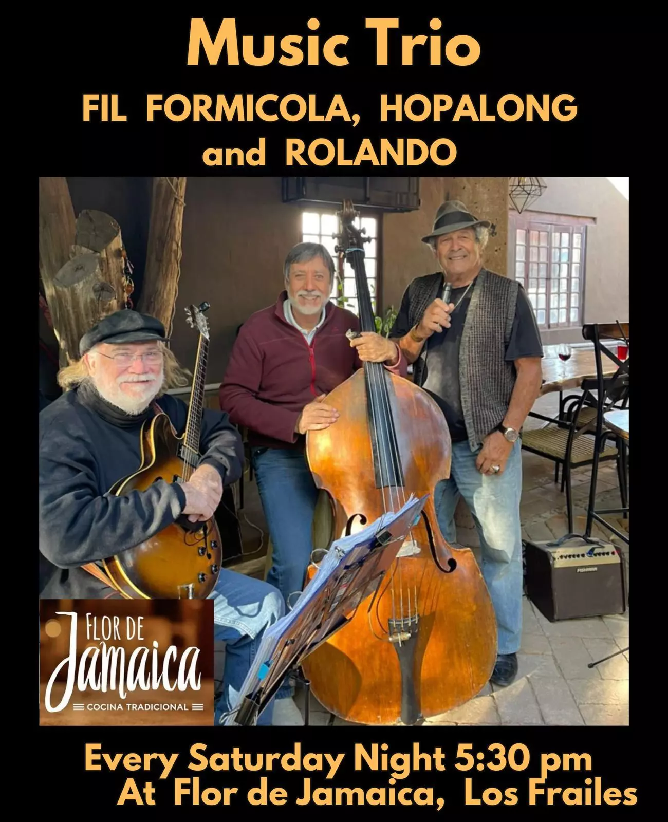 Good food, drink, music and sunset at Flor de Jamaica every Saturday with the Music Trio – Fil Formicola, Hopalong, and Rolando