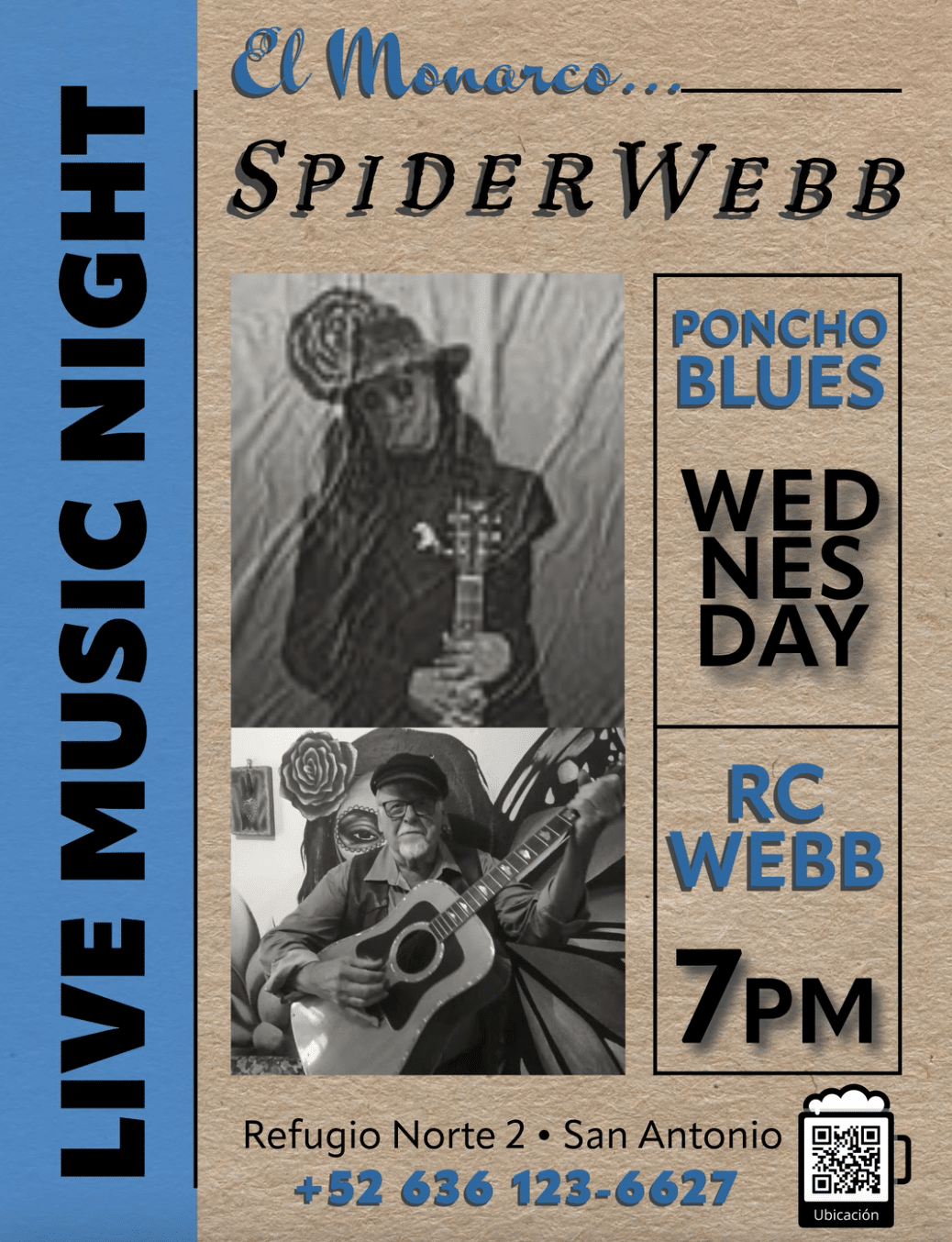 Tonight at 7pm, we have Richard Webb (RC) on acoustic and blues guitar, with Poncho Blues. RC is a Blues-expert, former Woodstock-hippie, songwriter, more. They will be playing Blues, Honky-Tonk, Roadhouse, Tex-Mex....
