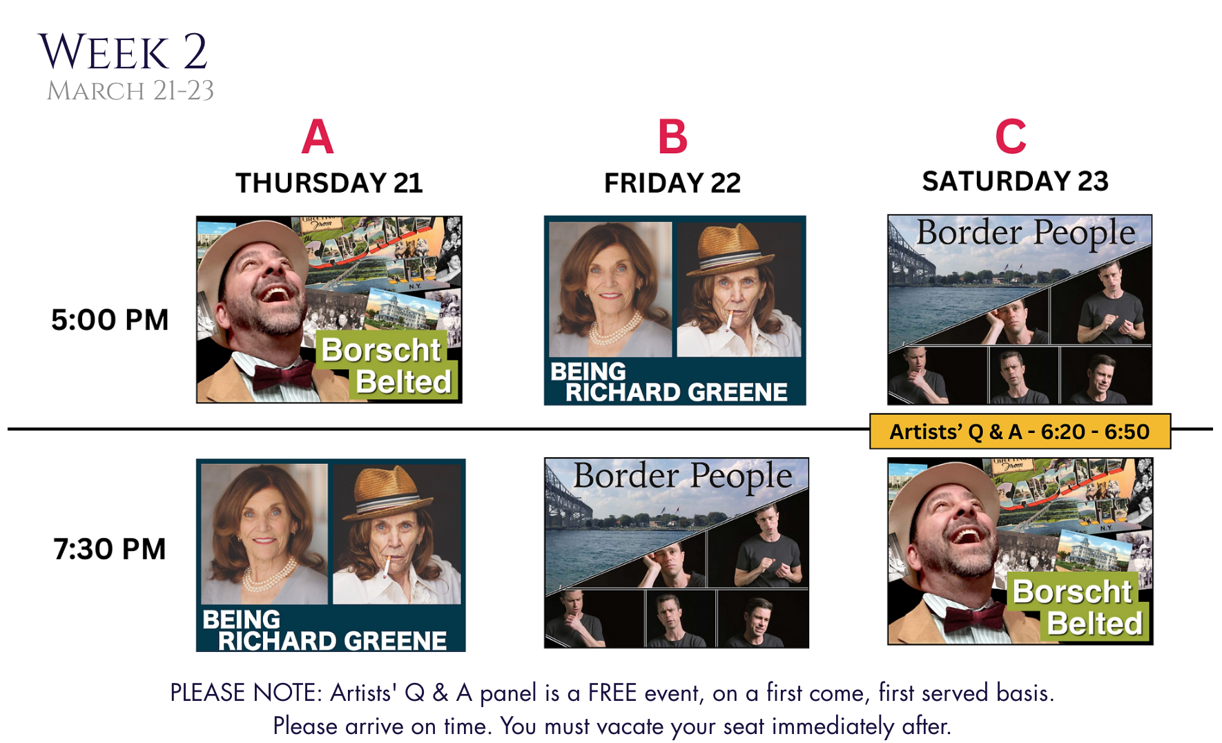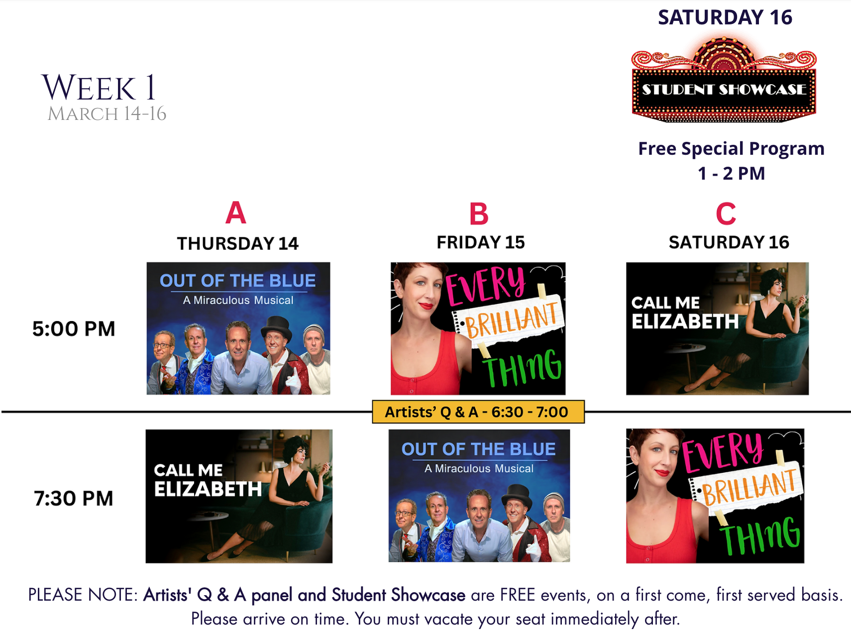 We hope you'll join us for all six shows (it'll be hard to choose, we know!) Free Q and A artists' panel, engaging Masterclasses taught by the artists, and the Free Student Showcase, giving solo artists in the making a chance to share what they're bringing to light!